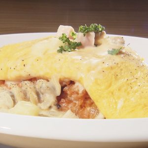 今回おすすめするのは、お店一番人気「オムシチュー」!バターライスにふわとろたまご、その上にビーフシチューをたっぷりと。たまごはチーズ入り、高温のフライパンでいっきに仕上げます。ビーフシチューには赤ワインをたっぷり使用♪